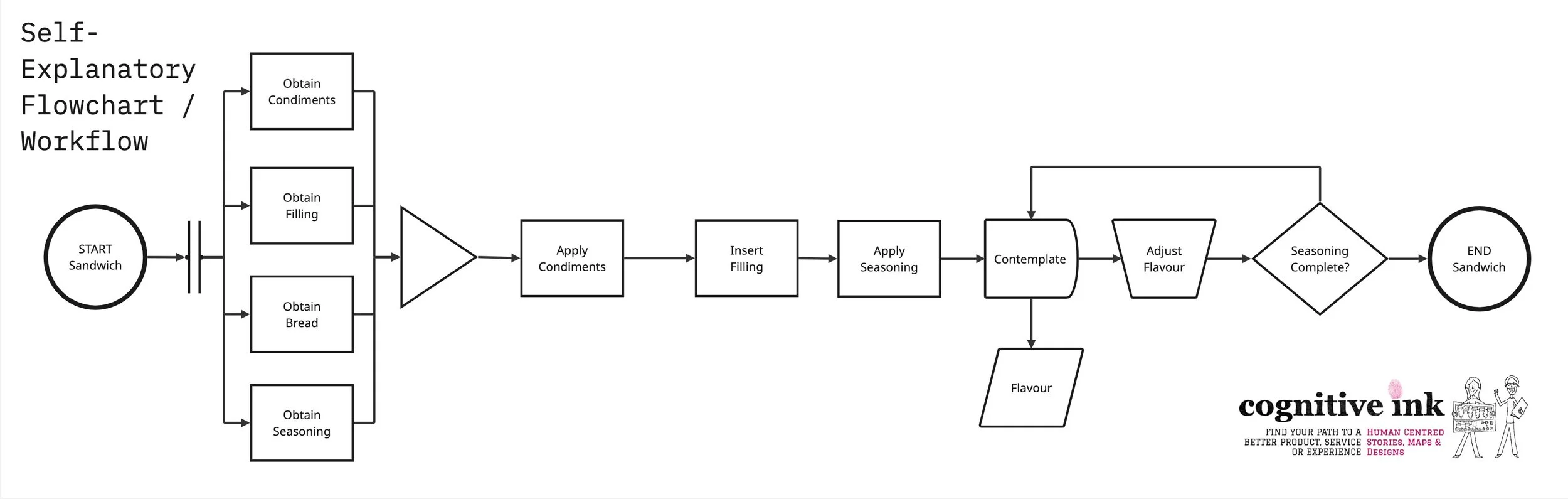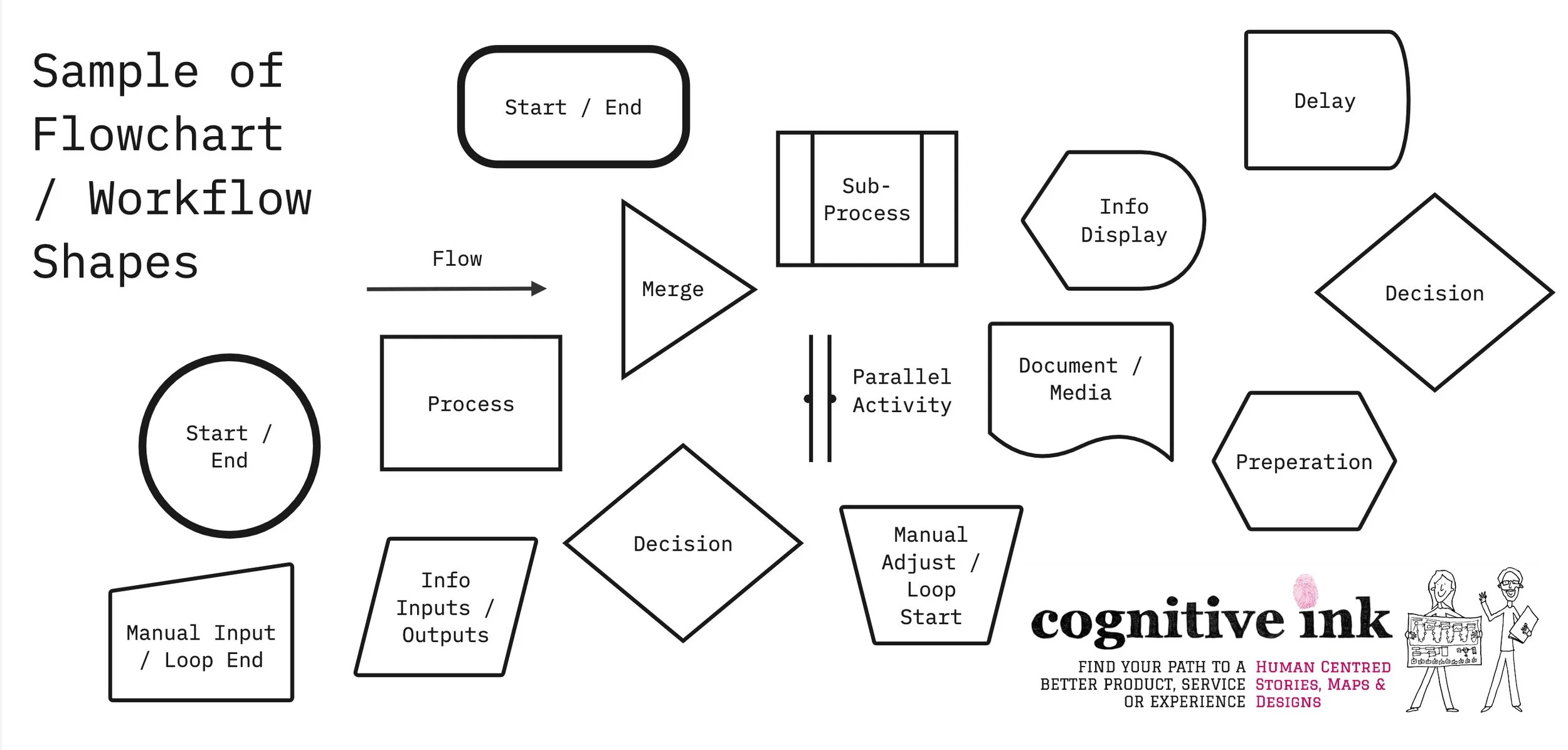 At Cognitive Ink, we use a pseudo-formal approach to flowcharts, borrowing elements, but not using the formal symbols offered by IBM, the American National Standards Institute (ANSI) and the International Standards Organisation (ISO).