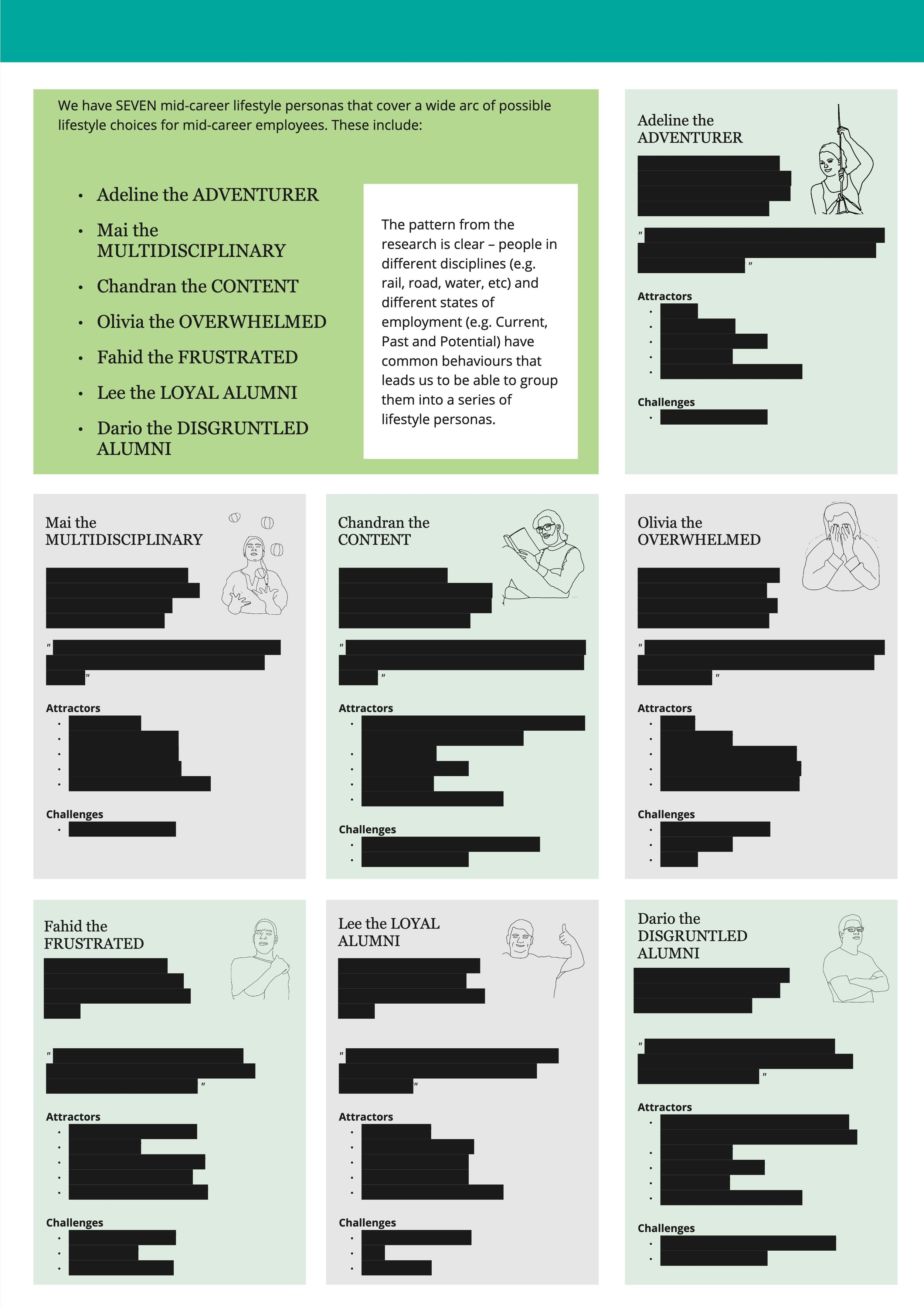 The personas, seven for mid-career and eight for senior, were the core deliverable for the client.