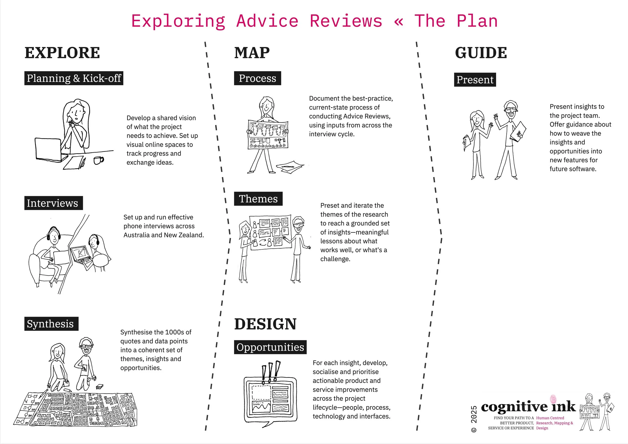 Using a semi-structured interview format, we talked through the end-to-end review experience with advisers. We sourced specific review customers as examples and uncovered insights about the highs and lows of the process.